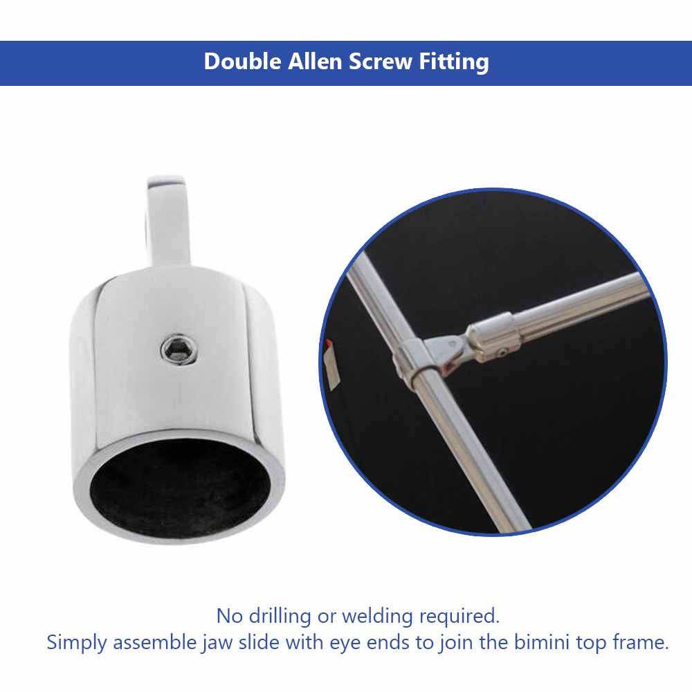 • [Easy to use] No drilling or welding required. Simply assemble jaw slide with eye ends to join the bimini top frame, then tighten screws to secure the inserted poles in place.